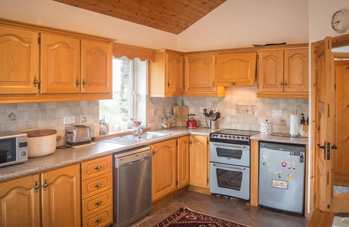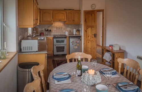 Fitted kitchen with a small fridge/freezer, dishwasher, oven, microwave, toaster, washing machine & dryer. Dining table seating 6 guests.