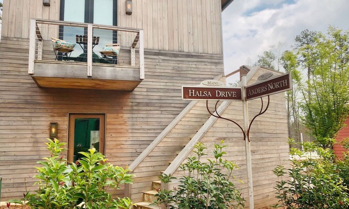 The master bedroom is off the kitchen/laundry area featuring barn doors, queen bed, SmartTV, and a private balcony that has an outdoor table, umbrella, and chairs for relaxing and/or dining. The master bath, accessible through both the bedroom and living room, includes a spacious walk-in shower and has plenty of storage, towels, and basic toiletries. The garage level has a half bathroom and a place to park one or two cars (so you can forget about them during your stay and take the golf cart instead). Also, included in our daily rate is a four-person golf cart to enable you to explore Serenbe in style and comfort.