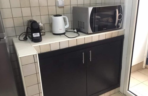 Well-Equipped Kitchen: Prepare small meals with ease in the fully equipped kitchen, complete with a microwave, coffee maker, electric kettle, and washing machine (laundry).