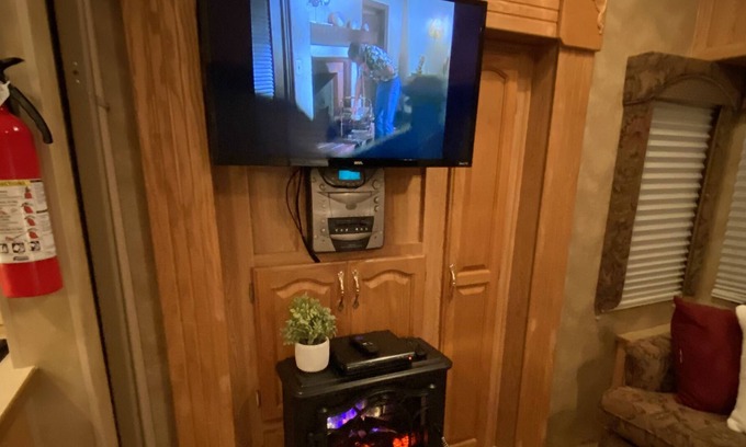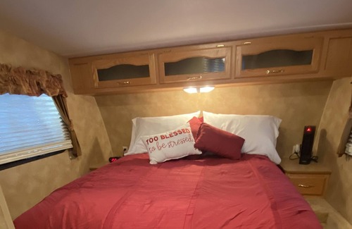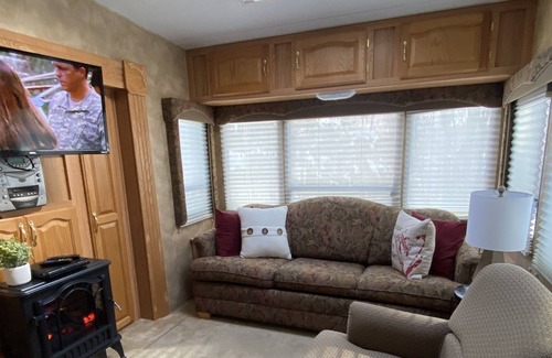 Escape the hustle and bustle by staying in a private RV that has all the amenities of home. Electric fireplace, fully furnished kitchen and bath, has all cookware and linens. All you need to being are your clothes. Sits in a private wooded park. Can accommodate up to 4 guests-has 1 full bedroom and a pull out sleeper sofa. Very private but close to grocery and retail stores.