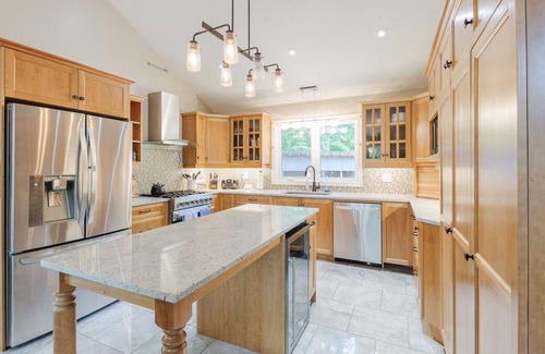 To the right is a large chef's kitchen with vaulted ceilings, perfect for entertaining, with a stunning gas stove, large island and dining area. Complimentary coffee and tea is provided to start your morning right.