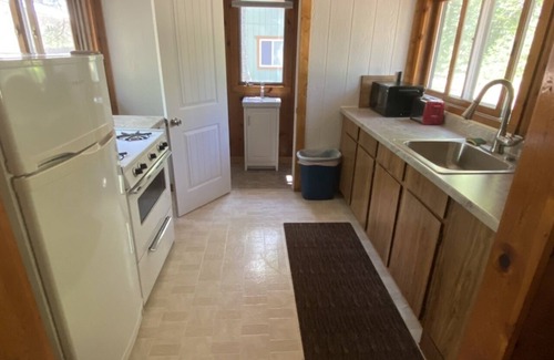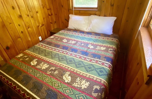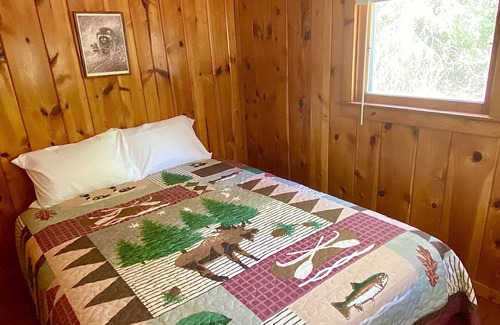 This Rustic Retreat offers traditional northern knotty pine interior while offering most modern amenities. Sleeps a total of six persons in two queen bedrooms featuring 12” memory foam mattresses and a queen sofa sleeper. Propane heat, electric throughout, kitchen with gas range, refrigerator, and coffee maker. Includes kitchen utensils, pots and pans, dishes and silverware, and an outdoor deck with gas grill. There is a bathroom with vanity and shower but no indoor toilet. It does have a new, clean, privy outside the door.