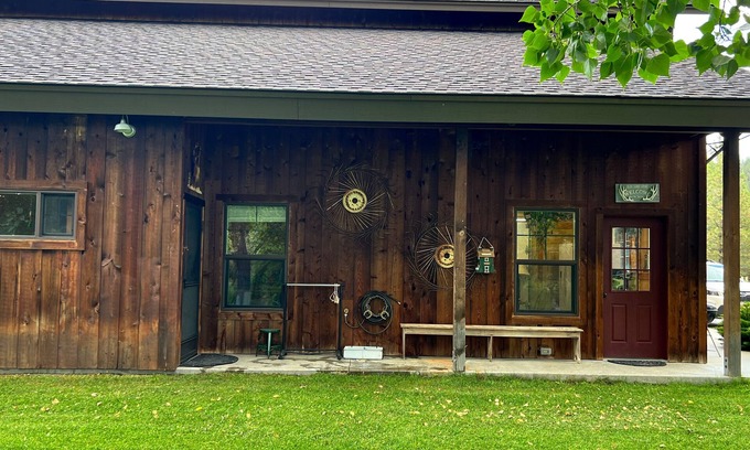 The Riverside Bungalow is an amazing, cozy river front cabin with a serene park-like setting. Experience the tranquility of nature in this charming 2 bed, 1 bath. Sleeping 4 guests comfortably and pet friendly, you can't go wrong with a stay at this fabulous place! Two private bedrooms, each with a Queen and a full bathroom are located together. Just outside the door, you will find the kitchenette with all you will need to prepare quick meals. A BBQ grill is available as well. Your furry friends are welcome to accompany you. The best is the outdoor paradise with an expansive lawn area, easy river access with a sandy beach area, fire pit and horseshoe pit. Centrally located you will have easy access to all Garden Valley has to offer! Please note the Bungalow is an in-law type unit on another property. Occupants of the main house may or may not be in residence at the time of your stay. Either way, the area between cabins and the river are open to all. Pets are welcome, but limited to 2 dogs and when inside, they must be crated. There are exterior security cameras placed around the property. Bring an extra 1-4 guests with their RV!