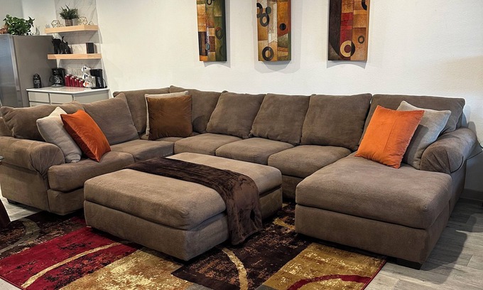 The open-concept design is ideal for entertainment, boasting 1,700 square feet of space. You'll find a spacious living area with a large sectional sofa and a flat-screen TV. The soothing natural colors create a calming atmosphere. The dining room also doubles as a game room, featuring a 3-in-1 dinner table, pool table, ping-pong table, wall tic-tac-toe, darts games, Connect four, and plenty of board games for your enjoyment.