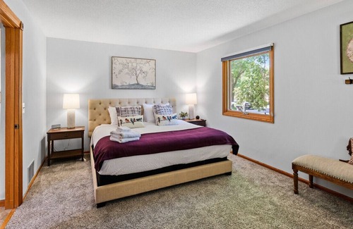 Welcome to your perfect home away from home in Maple Grove, Minnesota! Enjoy the stunning garden views and peaceful cul de sac living in this beautiful abode conveniently located near Elm Creek Park. With 5 bedrooms (3 up and 2 on the main level), you'll have plenty of space for you and your tribe. The garden view from your bedroom window will make waking up each morning even more enjoyable. Cook up delicious meals with complete appliances, plus enjoy making coffee with the coffee maker, K Pods or French Press, whichever you like! You can choose the sauna or simply relaxing on the patio after a day of exploring all Minneapolis/St. Paul area has to offer.