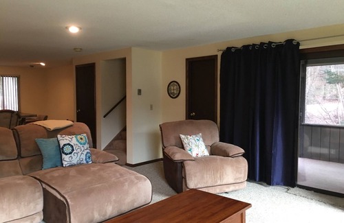 Enjoy a quiet summer night by the campfire after a fun filled day at our kid friendly association beach; just bring your towel and sunscreen as lounge chairs, umbrellas and a two person kayak are available to guests. Our private association beach is swim at your own risk. Step out the back door of our screened in porch, a 5 minute walk along the shore of Tripp Lake or a wooded adventurous path leads you to the fun at the beach. Har-tru tennis and pickle ball courts, basketball, badminton and bocce are a 2 minute walk, golf at Green Mansions Golf Course is a 5 minute drive . Games and all of the comforts of home are provided in our comfortable, mountain retreat. Tripp Lake is a non-motorized lake. Unit is not air conditioned.