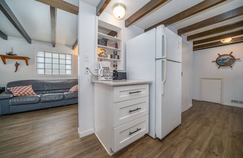 You'll find a cozy living room area with a brand new sleeper sofa, leather chairs, and a cozy natural gas fireplace next to the large flat screen TV where you can watch a movie on rental provided Netflix or sit and chat with a fresh cup of coffee in the early morning hours. Check out the view from the new bay windows while relaxing in the living room, or just take a stroll out onto the brand new deck! Take a quick trip out into the front yard for some sun or to enjoy the smell of the ocean breeze. You can even see the blue of the ocean from the living room.