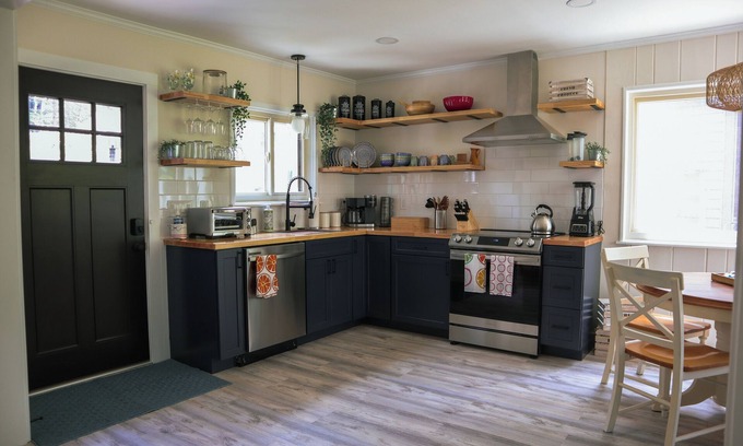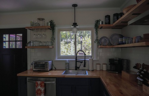 The kitchen is filled with warmth and is fully stocked with everything you may need for your stay. which include spices, coffee, tea, hot chocolate, silverware, plates, forks, spoons, knives and a full set of pots and pans, paper towels, napkins, and some breakfast items. Countertop appliances include coffee machine, ninja blender and toaster oven, microwave.