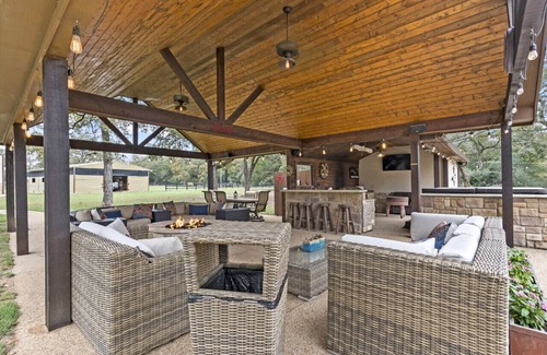 Step outside to embrace nature and the beauty of the Texas sunsets. Relax in the hot tub, cool off in the pool with beach entry and waterfalls, or fire up the pellet grill for a BBQ. The covered patio is an ideal spot to catch the game, making this retreat perfect for hosting and entertaining.