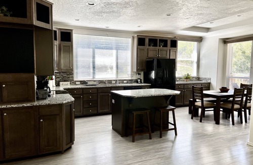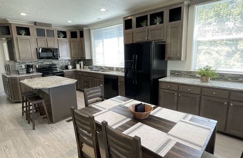 Our modern open floor kitchen is fully equipped with everything you need to prepare a delicious homemade meal. The wooden dining room table comfortably seats six and the breakfast bar provides additional informal seating for two. Plus, you can enjoy your meals on the deck or in the front yard, or have a summertime BBQ using the gas grill.