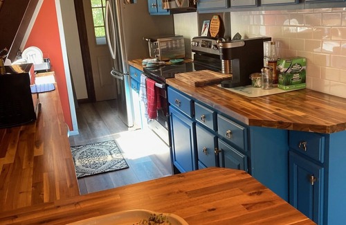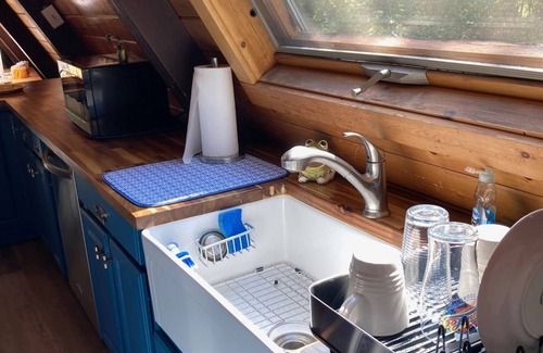 Back at the chalet, you'll find all the comforts of home and more. Curl up by the wood stove on a cool evening, or enjoy your favorite shows on the smart TV with satellite/streaming channels. Stay connected with the property's high-speed WiFi. In the fully stocked kitchen, you'll find everything you need to prepare delicious meals, from the stove and oven to the refrigerator, microwave, and dishwasher. Savor your culinary creations at the dining table, or step outside and dine al fresco. With air conditioning, heating, and linens provided, you'll be able to relax in comfort throughout your stay. Whether you're seeking a peaceful retreat or an adventure-filled getaway, our chalet in Hunter is the perfect home base for your Catskill Mountains vacation. There is a bedroom with a queen and single bed. There is also an open loft with a full and single bed.