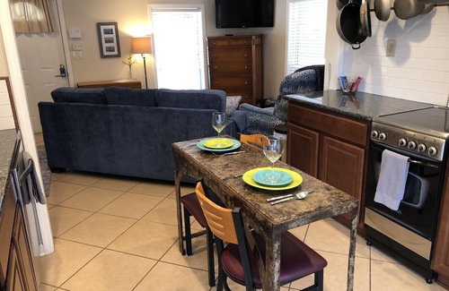 Part of a one-acre four-cottage sanctuary, Avalon Cottage is a wonderful, relaxing getaway for couples and small families. Nestled in the heart of the picturesque Lake District, our charming studio cottage in Hot Springs invites you to experience the perfect getaway. Imagine yourself relaxing in the cozy living area catching up on your favorite shows on the large internet-streaming TV and ... when weather allows ... enjoying our spacious outdoor deck with view of the lake. As you step into the fully stocked kitchen, you'll be delighted by the array of modern appliances, from the stove and oven to the refrigerator and dishwasher, allowing you to easily prepare delicious meals. Enjoy your culinary creations al fresco on the grill, or simply unwind with a refreshing beverage. When it's time to retire for the evening, retreat to the comfortable queen bed and new queen sleeper sofa, where you'll find plush linens to ensure a restful night's sleep. Venture out and explore the nearby attractions, including the Oaklawn Racing Casino Resort just a 6-minute drive away, the historic Bathhouse Row just 9 minutes away, and the stunning Hot Springs National Park just 10 minutes from your doorstep. Our property offers fun with a boat dock to tie off your boat, a boardwalk shoreline to toss a lure, and a swim deck all in our commonly-shared cottage setting. (NOTE: Lake Hamilton's water level is drawn down November through February every year, and during this time boats cannot reach our dock space). With amenities like WiFi, a washing machine and dryer, and games for both adults and children, this cottage is the perfect home base for your Hot Springs adventure.