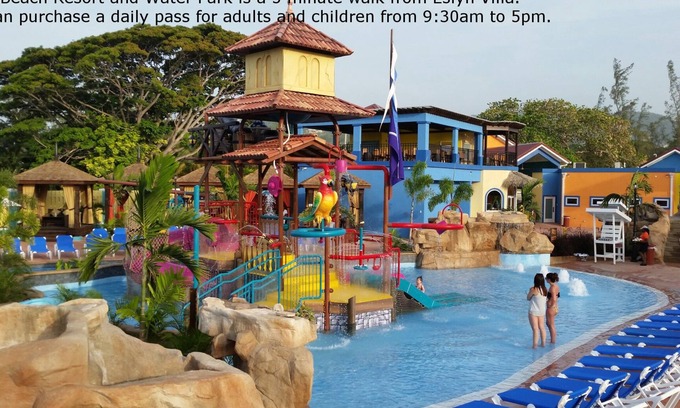 Eslyn is a charming five bedroom, five bath villa that comes with full staff (housekeeper / cook) , air-conditioning, and freshwater pool in a lovely private and safe setting. Located just across the street from a lovely private white sand beach and from Jewel Resort in Runaway Bay ... and just a five minute walk from the Superclubs Golf Course, makes this a prime location for a villa vacation! Just down the beach there is a water sports center and a seaside bar and cafe for daytime enjoyment and for a true Jamaican experience for Sunset happy hour and evening meals.