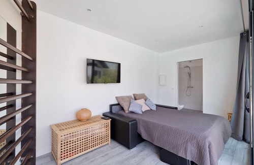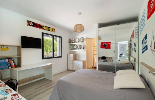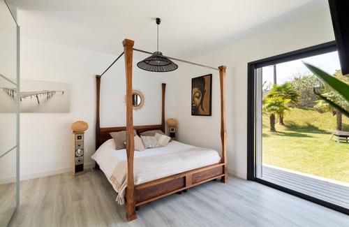 Superb contemporary house entirely on one level (adapted for people with reduced mobility) in a 7200 m² property including private forest, 3 cottages rented separately and small fishing pond. Close to the Basque coast and its beaches, this 2017 house with heated swimming pool and garden offers you a welcoming service: 4 bedrooms with television and each with its own shower- or bathroom, a beautiful, very well-equipped kitchen, a summer kitchen with barbecue and plancha, air conditioning, very large teak terrace around the swimming pool, a large an comfortable living dining room . A little away from the bustle of the coast, in a haven of peace, it only takes about ten minutes to reach the beaches. It's a novelty 2021, house never rented, come and discover it. The cleaning fee includes exit cleaning, administrative fees and linens, knowing that for your comfort, beds are made on arrival. The amenities (kitchen and bathroom) complete our services. Personalized welcome on arrival and departure.