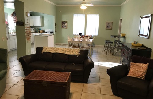 This property is ideal for a family or group of friends seeking a memorable vacation on Lake Eufaula! Our family lake home is nestled in the trees of a quiet neighborhood right off the beautiful water, with a 3 minute walk to a private beach! The house comes with a fully stocked kitchen; direct lake access; a patio deck w/outside dining; fire pit w/seating; large living areas; and 3 comfortable bedrooms in the main house and with a private, detached 4th bedroom. Lounge on the patio, enjoy the private sandy beach and spend the afternoon relaxing on the water. This property offers a private and peaceful retreat, tucked among the trees and a short walking distance to the water. Grill up a fresh meal for your group or gather around the fire pit or host yard games under the outdoor lights for a fun evening at home. The property is well equipped with comfortable furnishings and rustic accents that will make you feel right at home. Settle in and stretch out on the living room sofa and watch your favorite movie on the tv equipped with a DVD player. An open concept floor plan makes it easy to mix and mingle with your group. Take a seat at the bar top table or set the dining table for a family-style meal.
