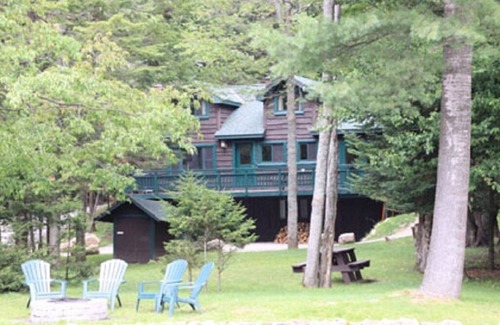 Evergreen Lodge is a waterfront house on the Fulton Chain of Lakes half a mile from downtown Old Forge.