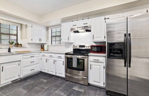 Guests will have access to the entire pictured house (besides the garage), all appliances, any kitchen supplies, and all amenities. We provide amenities in the bathrooms, kitchen, and laundry room with enough to get you started on your trip. We do not provide excess for more than a couple of days' worth, and guests are responsible for purchasing these items for personal use if they run out during their stay. There is an exterior camera that covers the back yard and pool area for the security of the property.