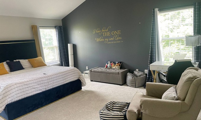 With 4 ensuite bedrooms and plenty of extra sleeping space, this lovely house is the perfect home base for your trip to Chesterfield. The calming view and sound of the pond and water fountain will be delightful & refreshing after a long day. This house is spacious and serene with 4 bedrooms, and plenty of extra sleeping space in the hearth room and kids room (fifth bedroom.) The 4 bathrooms are equipped with amenities like a bathtub and hairdryer. You'll be in close proximity to Lambert St Louis international airport, Faust park, the Butterfly house (one of Chesterfield's main attractions) & St Louis city. Whether you're exploring the city or relaxing at the property, you'll feel right at home. We extend a warm Chesterfield welcome to you and your company.