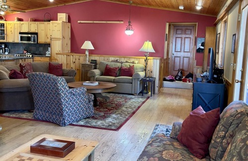 The spacious master suite is on the same level as the kitchen and great room. It has a comfortable California king bed as well as a 20 inch TV with cable and DVD, and private bathroom with a shower. The King bed offers a down comforter with a freshly cleaned duvet and a choice of foam or down pillows. Included in the primary suite is a comfortable lounging sofa and comfy chair for reading or watching movies. There is a private entrance to the deck through French doors if you want to sneak out for a private soak in our NEW hot tub after the kids are in bed. There is ample closet and dresser space. Views of the pine trees allow privacy from this spacious master suite.