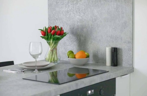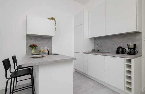 This spacious studio apartment offers accommodation for 2 people. It consists of a living room with kitchenette and a spacious bathroom with shower. The thoughtful design of the studio, together with the carefully selected furniture, significantly enhance the comfort and pleasure of your stay. Thanks to the harmonious combination of aesthetics and functionality, every moment spent in this apartment becomes not only relaxing, but also provides an unforgettable aesthetic experience that adds a unique touch to the entire stay experience. In the living room, guests can enjoy comfort, thanks to the presence of a sofa bed, conducive to relaxation and rest, an additional asset is the presence of a TV with access to the Smart TV function, which allows you to freely watch your favourite films in a comfortable atmosphere, ensuring full comfort during your stay. The kitchenette has been comprehensively equipped with all the necessary appliances, such as an induction hob, fridge with freezer and coffee machine, ensuring a comfortable stay and encouraging the exploration of culinary possibilities. The bathroom delights with a shower that provides the opportunity for moments of relaxation and unwinding after a busy day. A complimentary toiletries, towels and bed linen are provided for a good start to each arrival. Guests travelling with pets are welcome here, as the apartment is pet-friendly. An additional convenience for guests is the presence of a dispenser in the common corridor, offering cold sparkling and still water for drinking.