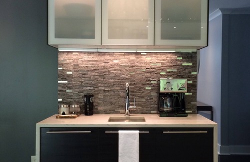• New Kitchen: Granite Waterfall Countertops, Extensive Custom Stone & Tile, Separate Wet Bar w/Remote Cabinet Lighting; Stainless Steel & Integrated Appliances; Floor to Ceiling Cabinets; Storage; Recessed GE Link Programmable Dimmable Lighting