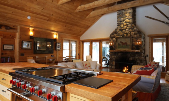 Built in 2007 our luxurious lakeside camp consists of a magnificent hand made adirondack style cedar shingle home and two cozy cabins. Privacy for all. You will enter the main house onto an 1,200sq/ft screened in porch with an outdoor stone fire place, pingpong, handcrafted pine harvest table that seats fourteen. French doors afford access into every room and can be left open to feel the Maine breezes. The great room in the center of the house boasts a magnificent indoor stone fireplace, multiple couches and handcrafted game table. For the chef in you the large chef’s kitchen fully appointed with huge 60" Wolf griddle top to make loads of pancakes, a double oven for baking and it is brand new 2017! , We have just added a new 42" new Sub Zero refrigerator for all your beautiful Maine produce! An original Monson slate farm troth sink will bring smiles as you and your family or friends create meals overlooking the lake and listening to the loons. Behind the kitchen is our Herb Garden and a grassy lawn for the children to run around on. Each bedroom has its own private bath each decorated in a different style. Each bedroom and cabin has a private screened porch with lake views. The furniture throughout the house was handmade by local carpenters and artisans.