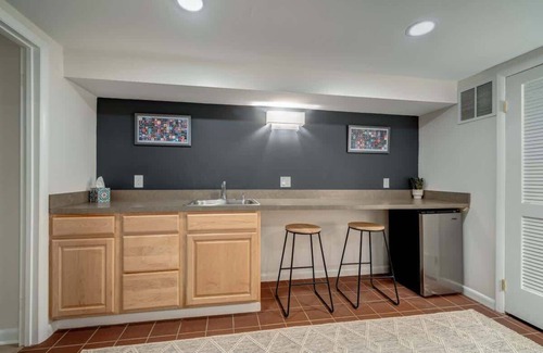 Descending to the lower level, discover a cozy sitting area with a smart TV, ideal for your streaming needs, along with another king suite featuring an attached private bathroom. A separate private entrance enhances convenience.