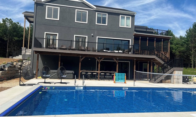 Relax, explore and enjoy your stay in this 6,000 sq ft home. Engulfed in light as you enter. 5 patios to enjoy the outdoors. 2 kitchens, Premium appliances, Kohler fixtures, Restoration Hardware furniture, two 77” TVs, 9-person Hot tub, 48’x24’ pool, pickleball court, huge fire pit, infrared sauna; and so much more. Sub Zero Ice Maker; Blackstone Grill and Big Green Egg for Outdoor gourmet cooking. Wooded 13 acres to explore paths and go for peaceful walks. You may see deer and wild turkeys.