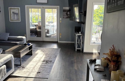 Room for 10+ Guests w Plenty of Space for Everyone… Featuring Granite Counter Tops , 3.5 Baths , A Bartesian Liquor Drink Maker, Office/Den Area with two built in Desks and Granite Stone Fireplace wall. The master bedroom featured an 85” Smart TV .. King Bed and a his and hers two sided bathroom with a Steam Shower in the middle as well as walks out to the lower deck where you can walk around the corner and overlook some wilderness where you will see Deer.. Wild Turkey. The pool enclosure area can be accessed from the den area or walk out from the theatre / bedroom downstairs.