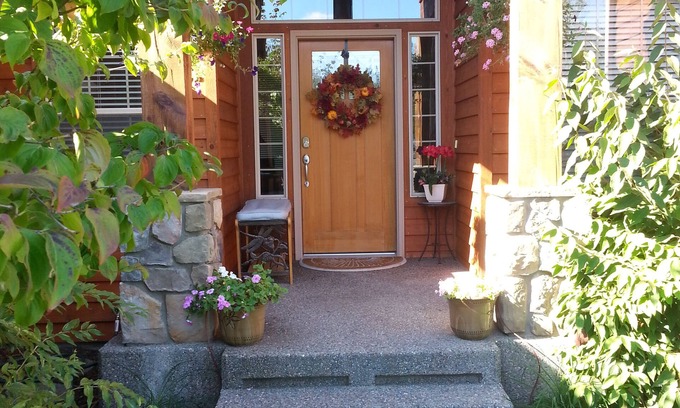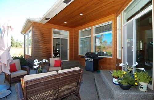 Amenities include: great room with gas fireplace, formal dining room, eat-in kitchen with granite counters and hardwood floors, dishwasher, gas stove/oven, microwave, washer/dryer, small appliances, and a built-in vacuum. Air conditioning is appreciated in the summer; fireplace in the winter. Enjoy peaceful, quiet BBQs on the private, covered and fenced garden patio. Park your cars or toys in the attached garage. Internet/ WIFI and 4 TVs with cable keeps you connected.