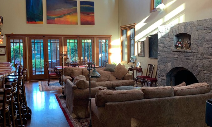 Spacious executive home was designed and built for entertaining. The great room accommodates a large bar that is integrated into the living space with the kitchen. The main room opens out to a Spanish style courtyard providing easy access for indoor and outdoor dining. Two bedrooms with a shared bath open on to the courtyard. A third bedroom suite is located off the entrance to the great room.This property is ideal for graduation. A master bedroom upstairs with complete shower and jet tub. A fourth queen bed is in a designated office with 1/2 bath.