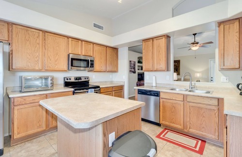 But the amenities don't stop there. Step outside to your own personal oasis, featuring a 3-hole putting green, a romantic outdoor fireplace, a covered patio, and a refreshing pool—perfect for lounging, grilling, or simply unwinding under the Arizona sun.