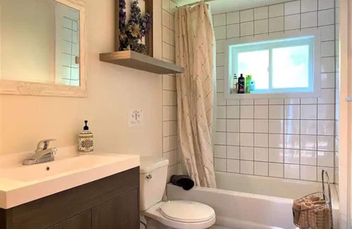 As you settle into this 2-bedroom, 1.5-bathroom rental, you'll find a BBQ grill, a fireplace, air conditioning, and a desk. The kitchen is equipped with an oven, a stovetop, and a refrigerator, as well as a coffee maker, a microwave, and cookware. And because there's a washer and dryer, you can go a bit lighter on your packing.