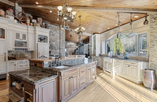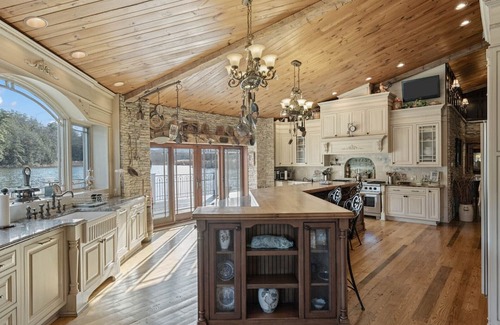 Inside, the main house welcomes you with an open layout bathed in natural light. The home is equipped with modern amenities including Wi-Fi, a washer and dryer, and central AC. The living spaces seamlessly flow from the living room to an expansive dining room, perfect for hosting large dinners. The gourmet kitchen, equipped with a coffee maker and top-of-the-line appliances, overlooks the mesmerizing lake. Additional comforts include a cozy fireplace, multiple sitting areas, work-from-home space, and easy access to the back patio. The lake house and pool house cottage, each with a small kitchen and living room, offer more intimate settings and privacy, with the latter featuring a pool table. The second lake-front guest cottage adds to the charm of this magnificent property with an additional private kitchenette.