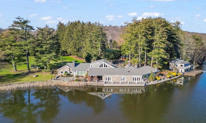 Welcome to Highland Hills Lake Compound in the picturesque Highland Hills of the Hudson Valley, NY, a sprawling 160-acre private compound encircling a stunning 37-acre private lake. Located just an hour and a half from New York City, this exclusive sanctuary is a stone's throw from state parks, hiking trails, and ski mountains, making it an idyllic escape for those seeking tranquility and adventure alike. The property boasts a beautifully designed main house and multiple charming guest cottages, accommodating up to 20 guests across 11 bedrooms and 8 bathrooms. Each space has been crafted to offer a cozy yet spacious experience, with a variety of sitting and dining areas that cater perfectly to both families and large groups.