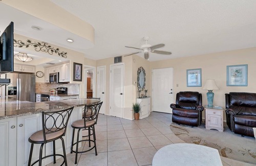 The living room is bright and beautiful with cool tile flooring where sliders beckon you towards an enclosed balcony offering an abundance of seating for all to enjoy awe-inspiring, breathtaking displays every single night; a perfect symphony of colors paint the sky. Indulge in an afternoon siesta cradled in one of two comfy, rich brown leather recliners, immersing yourself in relaxation. As the day gracefully transitions into evening, venture out for a delectable dinner experience, capping off the day in style.