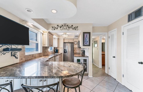 This lovely 5th floor condo provides all you need for a great beach vacation. There's a full size alley kitchen with stainless appliances, natural stone counters, ivory cabinets stocked with dishes, glasses, coffee cups, & basic appliances all included. Dining for 4 people outside on the balcony however, there is kitchen counter bar seating as well.