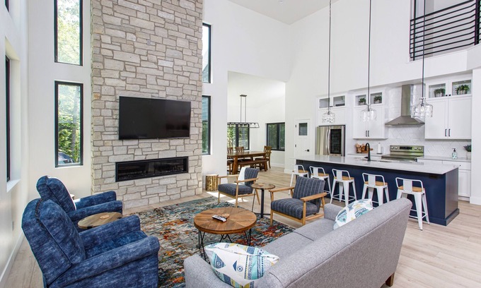 The main level has a beautiful, modern kitchen that is fully stocked for all of your cooking needs and a large dining room table. Gather around the fireplace in the family room on cool evenings. There are 4 bedrooms total: 3 with queen beds, a bedroom with 6 XL twin sleeping spaces, and 2.5 bathrooms.