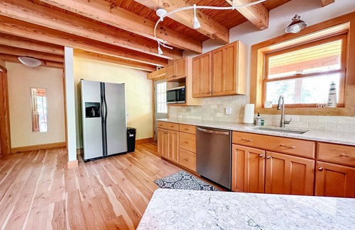 The expansive yard provides ample space for outdoor games, and a fire pit invites cozy campfires under the stars. The new additions for 2024, including MiniSplit Air Conditioning with separate controls in each bedroom and the living area, ensure a comfortable stay. Revel in the refreshed interior with new mattresses, floors, and quartz countertops, elevating your experience.