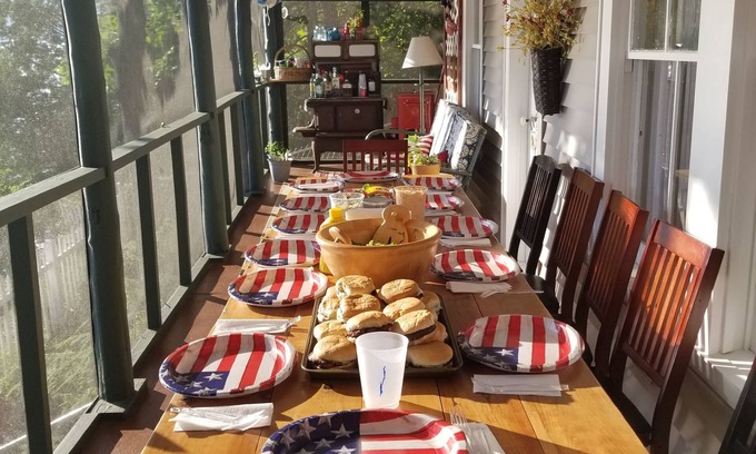 It is a 4 bedroom home with wonderful porches on the bedroom floor and the main floor which look right out on the lake. Grab a cup of coffee or a glass of wine and sit outside your bedroom on the upstairs porch and enjoy watching the ducks on the lake, or do alittle fishing right on the docks. For early birds take your coffee to the 30 foot porch on the main level or right down to the dock for an up front and personal view of the lake. Evening cocktails and dinner are amaxing on the main porch! There is plenty of room for sitting on the various wicker furniture and or dining at the spacious outddoor dining table. Its a beautiful view of the lake and enjoyable to watch the kayakers or boaters going by as well right from the enclosed screen porch. After dinner watch the sunset from the porch or dock or light up the firepit and cook up some smores! Although there is a smart TV in the livingroom if the weather is good I'm betting you wont use it!