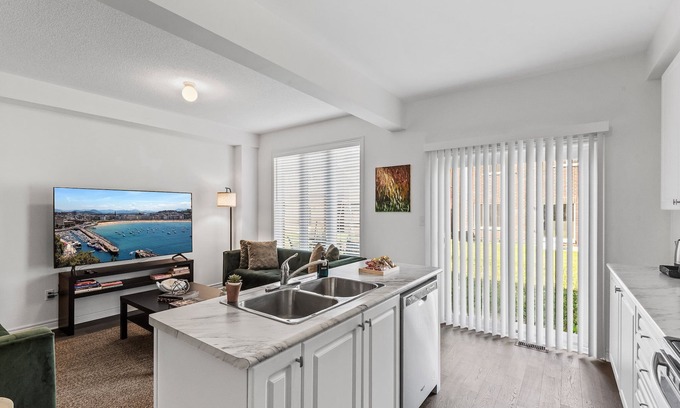 Accommodating up to 10 guests. Experience comfort & luxury in our modern 4+1 bedroom & 3.5 bath Townhome. Chic design with open concept layout. This peaceful haven offers all the amenities. Enjoy the comfort of the living room with Smart-TV for endless entertainment, fully equipped kitchen, free 2 parking spots with 220v outlet for your EV charger. Perfect for families, friends or business travelers. Book now for a memorable stay. Drive 5 minutes to the Mall, 10 minutes to Go train, 30 minutes to Toronto.