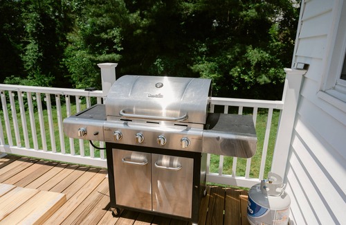 The upper level features a fully stocked, eat-in kitchen with a large farmhouse dining table. Walk out to the upper deck, with a propane grill and additional dining table. The main living area has a Roku TV and there is high speed internet throughout the house. On the main floor, the primary bedroom features a king bed with attached full bathroom with shower. There are two additional queen bedrooms and another full bath with tub/shower combination on the main floor.