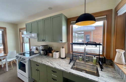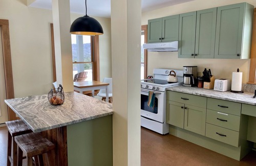 Ascutney Cabin is great for couples or families with small children. This is a PET FRIENDLY cabin. The cabin is about 660 sq feet. It has a fully equipped kitchen, a private bathroom with a tub/ shower combo, a comfortable size bedroom with a queen bed, and a sofa sleeper in the living area that has a queen mattress. Enjoy your breakfast of farm fresh eggs while sitting in your little breakfast nook and stare out the big windows at the beautiful views.