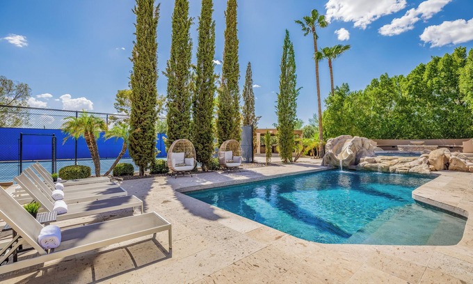Welcome to Hidden Paradise - your ultimate Scottsdale getaway that's centrally located near Scottsdale's top attractions! This luxurious 5,600 sq. ft. estate on over an acre features a heated pool with a waterslide, a sports court for tennis, pickleball, and basketball, and a game room with a pool table. With 6 spacious bedrooms, 4 bathrooms, outdoor access from every room, and an outdoor ramada with a barbecue, it's the perfect home for families and groups. Book your stay today!