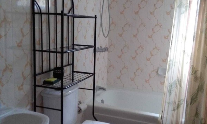 Features two large bedrooms with double size beds on the main floor, and upstairs we have another large bedroom with a queen-sized bed. We have two bathrooms with shower/tubs, one on each floor. And on the main floor a full kitchen (large sink, microwave, oven, gas stove-top, refrigerator/freezer), living room with television and couches.
