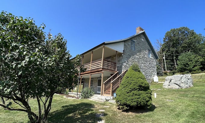 This is an 1800 stone house with two steep and winding staircases. If you have mobility issues this is not a suitable home for you. You must watch your head going between rooms and doorways. The basement, with hand hewn chestnut log ceiling, holds the laundry and game room. The second floor is the kitchen, living room, quarter bath and access to a mahogany deck with spectacular views. The third floor holds two bedrooms, office space and a full bath with shower and clawfoot tub. Step outsid to a mahogany deck with spectacular views. There is a spring house and two spring fed ponds, a railroad track runs at the bottom of the property, about five acres away. you will hear a slow moving freight train pass once or twice a day.