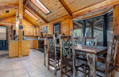 The rustic luxury cabin dining area is the perfect place to enjoy a meal with friends and family. Featuring rustic wooden furniture, a cozy fireplace, and a large picture window overlooking the surrounding wilderness, this dining area has a unique charm that can't be replicated. The warm and inviting atmosphere will make you feel right at home as you enjoy a delicious meal. Whether it's a romantic dinner for two or a family gathering, this cabin dining area is sure to create lasting memories.