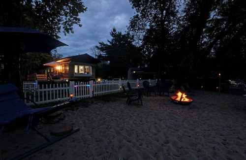 Imagine a beautiful sunrise/sunset on a private beach with a fire pit, gorgeous colored lights around the property, a hanging lounge chaise, ten more chairs, a picnic table, a paddle boat, and kayaks. The large deck has a charcoal grill and a park grill on the beach, plus rocking chairs, a lighted sun umbrella, seating for six, a three-person swing set, and a fence in the yard for your kids and dogs. The property has been completely updated and features a washer and dryer, a TV with local channels, a Samsung TV, and plenty of additional TV apps to which you can sign in. Additionally, an outdoor, waterproof, portable blue speaker provides high-speed internet, Wi-Fi, a cell booster, a cell charger compatible with all phone types, and air conditioning in each room. The fully equipped kitchen is for cooking. There is a shed full of games, sand, water, fun toys, and life jackets for humans and dogs. There are no extra fees for cleaning, coffee, paddle boats, kayaks, beach towels, or using a washer/dryer—great location to see Upper Michigan Destinations. Long-term guests (30 days or more) should email for a price quote. A 1.5-hour drive to Door County from the cabin, and we offer a much lower price per night with more privacy.