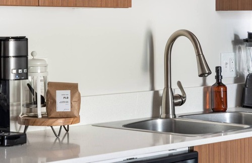 The fully-equipped kitchen is stocked with new stainless steel appliances, microwave, blender, toaster and a separate coffee/tea station to make starting your day a breeze. A new island with seating for 4 lets everyone gather around the kitchen for meals or your in-home wine tastings. The banquette also seats 4 and is a comfy spot to get some work done while you have TV on in the background.