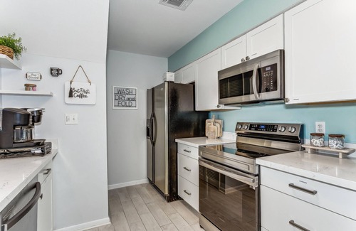 The kitchen, equipped with all stainless-steel appliances, is a culinary haven. An island with four bar chairs creates a central hub, ideal for casual meals or enjoying morning coffee. Keurig or drip coffee maker available.